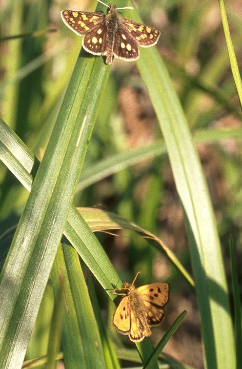 Carterocephalus palaemon (Pallas, 1771) albiguttata Christoph, 1893 (Checquered Skipper) (above) and C. silvicola (Meigen, 1829) (Northern Chequered Skipper) (below)