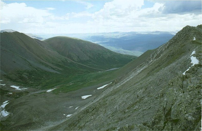 Вид с гребня цирка в долину безымянной речки, стекающей с южного макросклона Южно-Чуйского хреюта между реками Чикты и Акбул. Светро-зеленое - альпийское луга, темно-зеленое на склонах вдали - заросли карликовой березки (Betula rotundifolia Spach; = Betula nana L. ssp. rotundifolia (Spach) Malyshev).