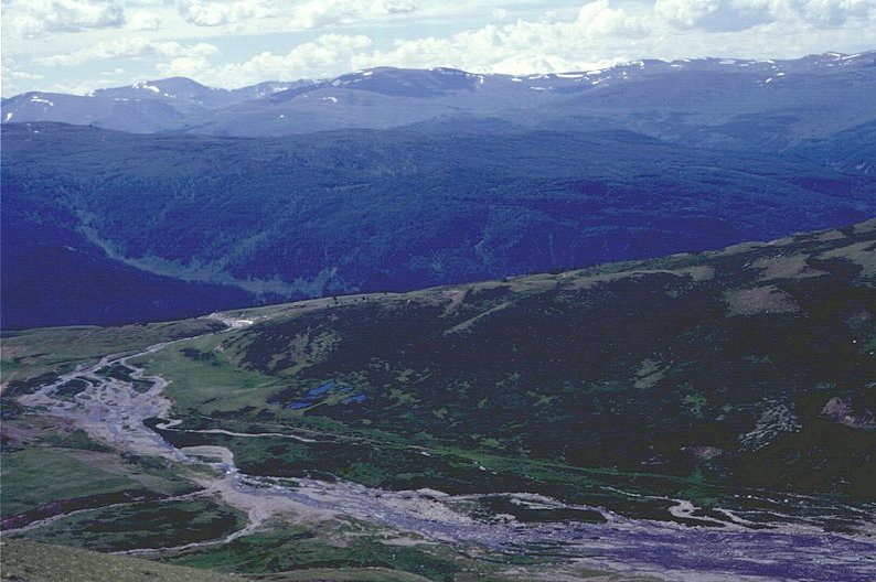 From a ridge between the headwaters of the Chikty Rivulet 2500 m above sea level, the upper Dzhazator River basin, Kosh-Agach District, Altai Republic, the Altai Mts., West Siberia, Russia. 10th July 1998.