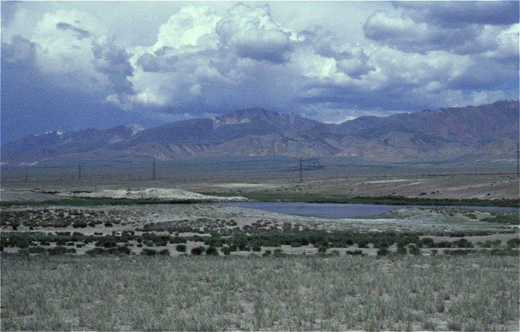 A highland cryophyte detritous semidesert of a Mongolian type called Chuiskaya Step', situated in the SE (Russian) Altai Mts. in a hollow between the Kuraiskii (seen apart) and Yuzhno-Chuiskii mountain ranges, at 1800 m above sea level. It is specked with small lakes, such as that seen, with the banks covered with sparse large tussocks of Achnaterum splendens (Trin.) Nevski (= Lasiagrostis splendens (Trin.) Kunth.), locally called "chii".