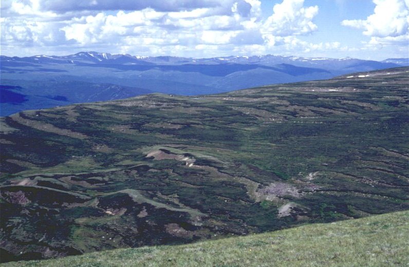 From a ridge between the headwaters of the Chikty Rivulet 2500 m above sea level, the upper Dzhazator River basin, Kosh-Agach District, Altai Republic, the Altai Mts., West Siberia, Russia. 13th July 1998.