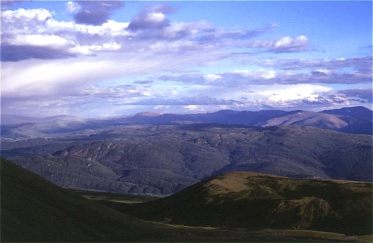 A view on the northern outpost of the Ukok Plateau in SE [within Russia] Altai Mts in the evening. They are covered with the taiga of siberian larch (Larix sibirica), while most of the plateau is tundrous.