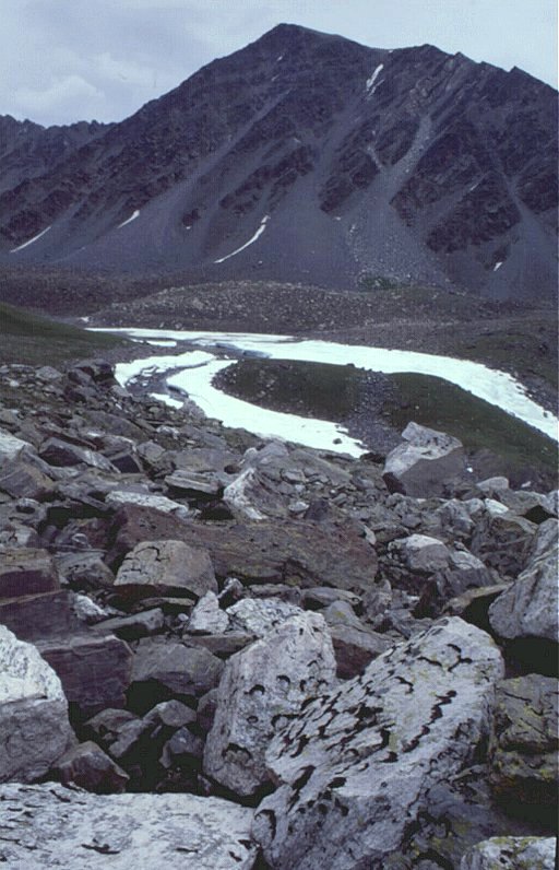 An ancient moraine closing the cirque of the sources of the rivulet descending southward from the the Yuzhno-Chuiskii mountain range between the Chikty and Akbul Rivulet, 2600 m above sea level, the upper Dzhazator River basin, Kosh-Agach District, Altai Republic, West Siberia, Russia. 11th July 1998. O. Kosterin.