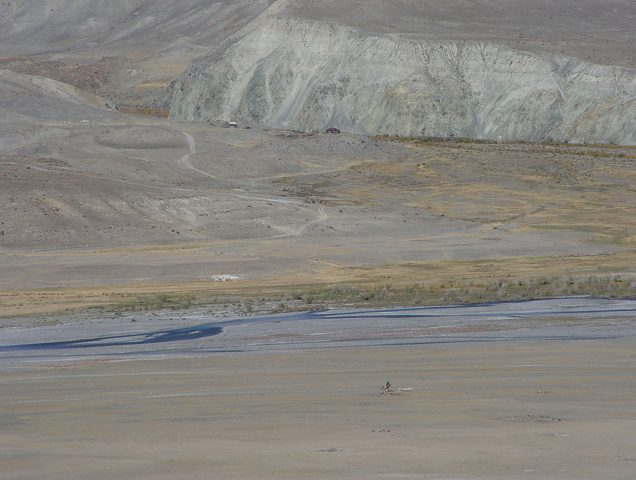Чабан с небольшим стадом овец (его юрта видна вдали) в долине р. Талдура (приток р. Чаган), 4 км ЮЗ с. Бельтир, северный макросклон Южно-Чуйского хр., Юго-восточный Алтай. 17 сентября 2004 г.