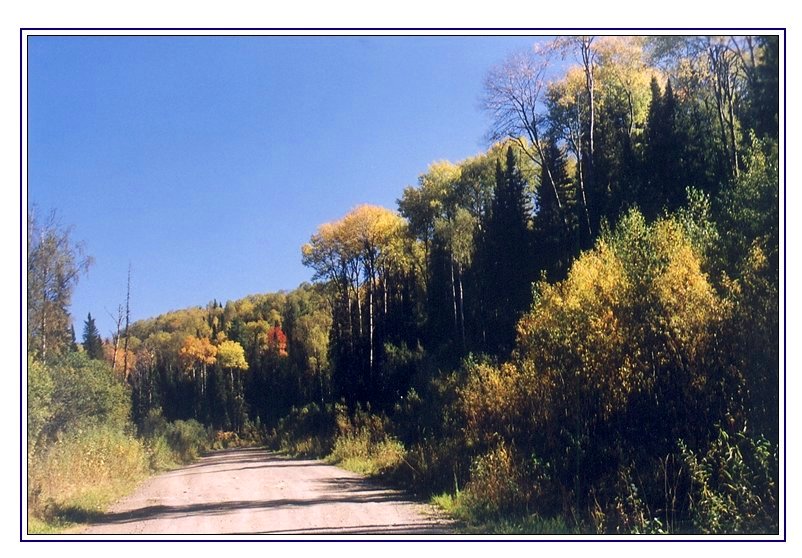 The so-called "chernevaya taiga" - a southern variant of humid taiga dominated by fir and aspen and enriched with relic nemoral species, it is thought to be a derivative of the former Holocene broad-leafed forests of the Altai-Sayan mountain system. A road between the villages of Biika and Chuika, Turochak District, Altai Republic, Siberia, Russia. 21st September 2002.