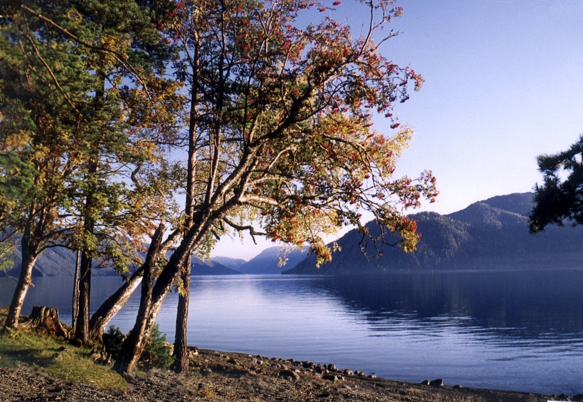 Lake Teletskoe, the NE corner at Yaylyu village, an upstream view, Turochak District, Altai Republic, Siberia, Russia. 21st September 2002.