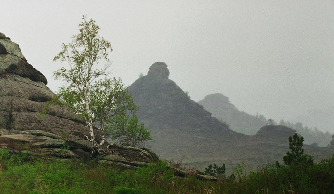 Granite cliffs (zeugen) on the northern bank of Kolyvanskoe Lake in West Altai. Zmeinogorsk District, Altaiskii Krai Province, West Siberia, Russia. 10th May, 2002.