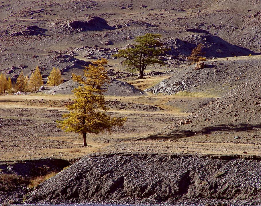 Лиственницы сибирские (Larix sibirica Ledeb.) на правом борту долины р. Талдура (приток р. Чаган), около 10 км ЮЗ с. Бельтир, северный макросклон Южно-Чуйского хр., Юго-восточный Алтай. 17 сентября 2004 г.