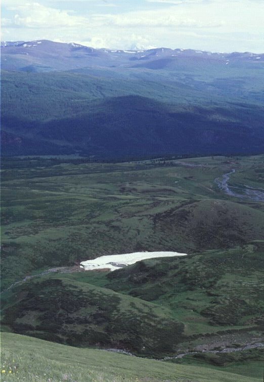 A ridge between the headwaters of the Chikty Rivulet, the upper Dzhazator River basin, Kosh-Agach District, Altai Republic, West Siberia, Russia. 10th July 1998.