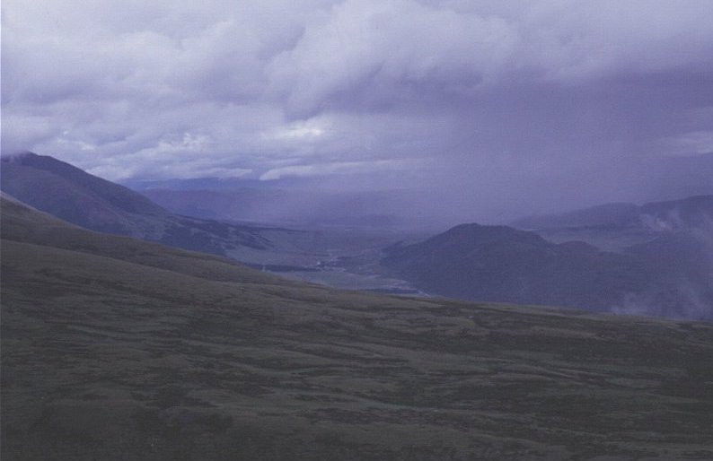 Rain over the southern principal slope of the Yuzhno-Chuiskii mountain range. Greyish is a montane tundra with dominance of Kobresia myosuroides (Vill.) Fiori et Paol. (Cyperaceae), dark green thickets are dwarf birch (Betula rotundifolia Spach; = Betula nana L. ssp. rotundifolia (Spach) Malyshev) tundras.