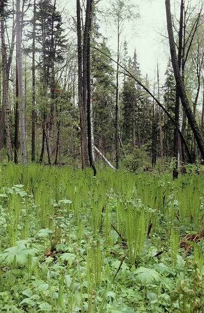 A patch, with Matteucia strutiopteris L. Tod. dominating in the underlayer, in a forest of a relic Siberian species Tilia sibirica Fisch. scarcely found in North Altai and forming an area of contiguous forests between the Kondoma and Mras-Su Rivers on the elevation of Gornaya Shoria (Kemerovo Region), where photographed about 3 km NE of the junction of Bol'shoi Tesh and Malyi Tesh Rivers. 17th May 1995.