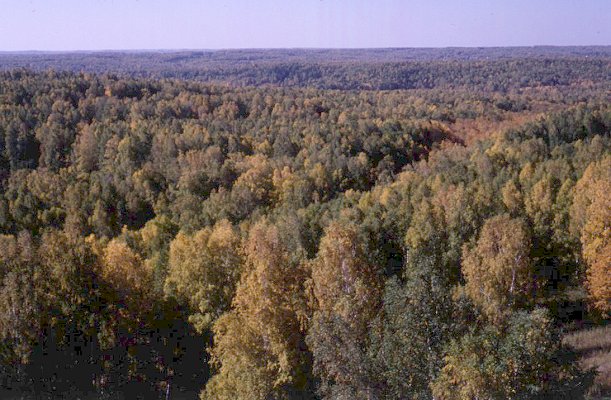 Birch (Betula pendula Roth. (= Betula verrucosa Ehrh.) forests of the forest-steppe zone of West Siberia, with admixture of asps (Populua tremula), when the leaves have just started to become yellow.