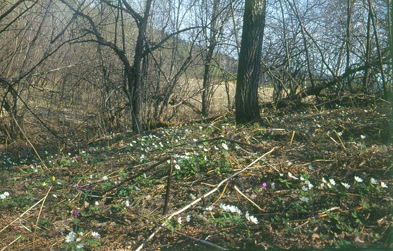 A flowering epemeroid plant Anemone altaica Fischer ex C. A. Meyer (= Anemonoides altaica (C.A. Meyer) Holub., under the bird cerries (Padus avium Mill.). Surroundings of the village Novososedovo, Iskitim District, Novosibirsk Region, West Siberia, Russia. 9th May 1996. O. Kosterin