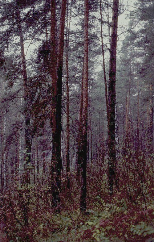 Pine (Pinus sylvestris L.forest), with Spiraea media bush layer, above a high rocly bank of the Berd' River crossing the Salairskii Kryazh elevation, the NW extreme of the Altai-Sayan Mountain System.
