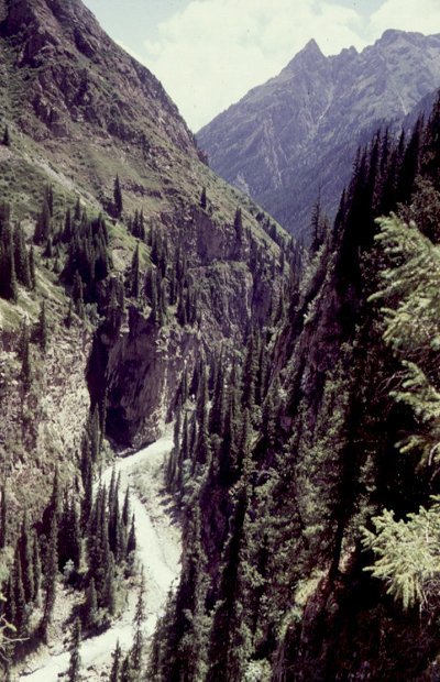 A narrow gorge of the Sargir river (the Usek river basin) valley (2700 m altitude), covered with the tien schan spruce (Picea schrenkiana Fisch. et Mey.) forest, in the mountain massif Tyshkantau (Southern Dzhungarian Alatau mountain chain).