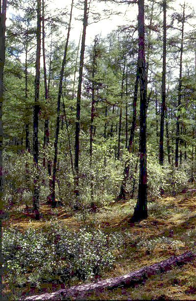 The Dahurian larch (Larix gmelinii (Rupr.) Rupr.) ranges east of the Enisei River to Transbaikalia and Yakutia.
