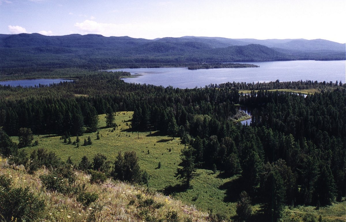 Lake Azas, situating in the Todzha Intermontane Hollow in NE part of Tyva Republic (Tuva), being the catchment of the Bii-Khem or Great Enisei River. It is mostly occupied by larch (Larix sibirica Ledeb.) taiga (seen), less abundantly spruce (Picea obovata Ledeb.) and Siberian stone pine (Pinus sibirica Du Tour) taiga.
