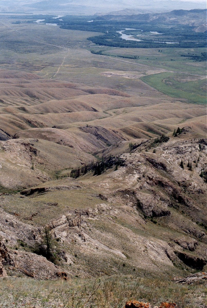 Erosion pattern of arid pediments of the western spurs of Academician Obruchev Mts. at the mountain Ondum. Russia, Siberia, Tyva Republic, 20 km E of city Kyzyl, at village Koktei, 51o44' N 94o42' E, alt. 1200 m, 30th July 2000. O. Kosterin.