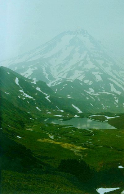 An extinct volcano Vilyuchinskaya Sopka, with Lake Zelenoe [Russ. "green"] at its foot, at a misty weather 80 km S of Petropavlovsk-Kamchatskiy, South Kamchatka, Russia. 5th August 1991. Oleg Kosterin.