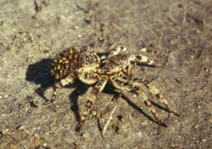 Lycosa singoriensis, the Russian Tarantul, a female with her