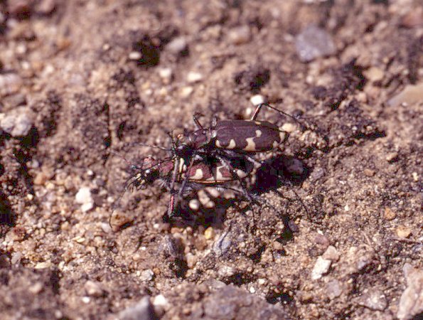 Mating tiger-beetles Cicindela restricta Fisch., ranging in the forest zone from E Europe to the Pacific.