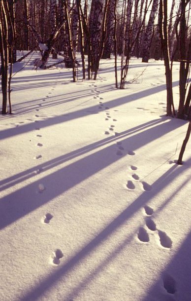 Blue, or Alpine Hare (Lepus timidus L.) and the Pole Cat (Mustela eversmanni Lesson) tracks on the snow in an open aspen in the Volchikha Rivulet basin 15 km SE of Akademgorodok [Academy Town], Novosibirsk, W Siberia, Russia. 12th February