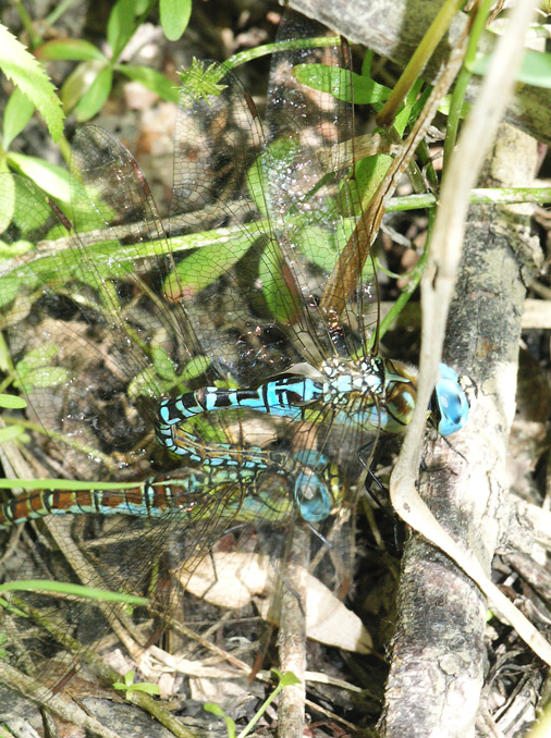 a tandem ovipositing on a stick at a dried out floodland boglet