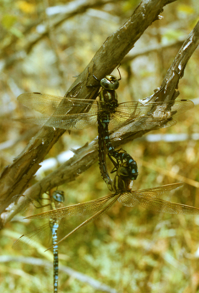 Aeshna juncea (Linnaeus, 1758), with a male of Aeshna mixta Latreille, 1805 on the backgeound