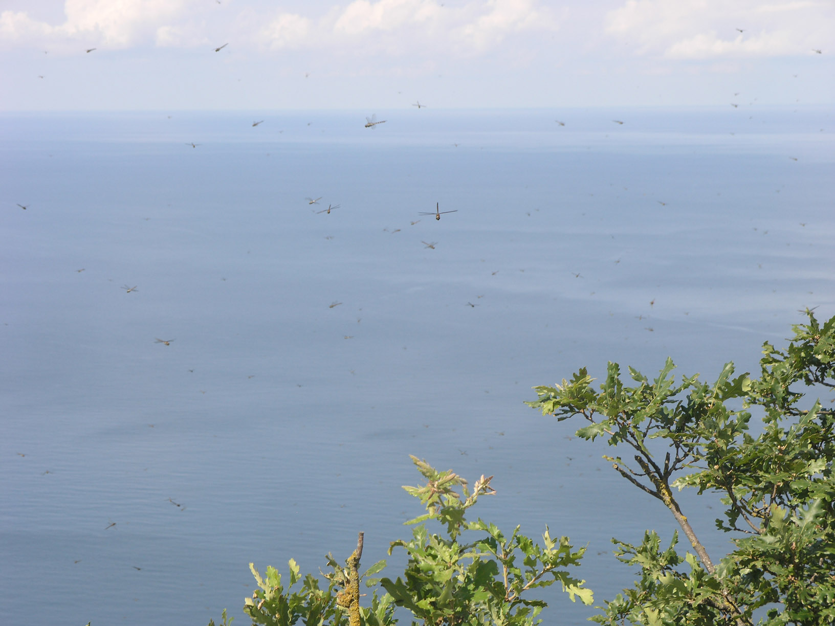 огромный трофический рой у крыши беседки на вершине обращенного к морю утеса