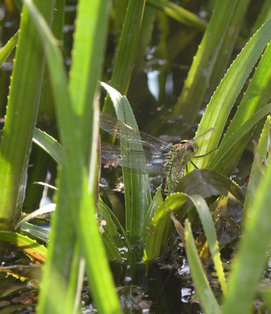 Самка коромысла зеленого (Aeshna viridis Eversmann, 1836), яйцекладущая в телорез (Stratiotes aloides L.).