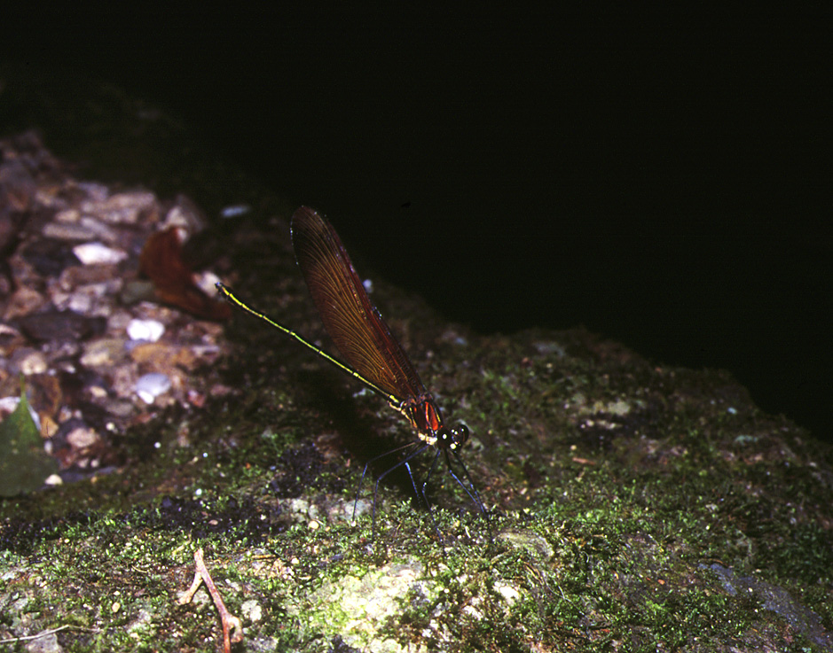 Река Шибу, тенистый правый берег возле деревни Хидака, Префектура Кочи, Сикоку, Япония. 5 августа 2002 г.