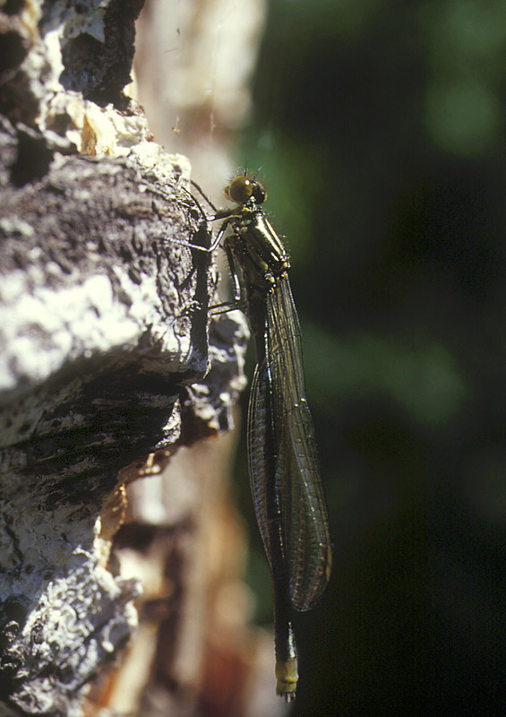 a teneral male on a birch trunk at a pond.