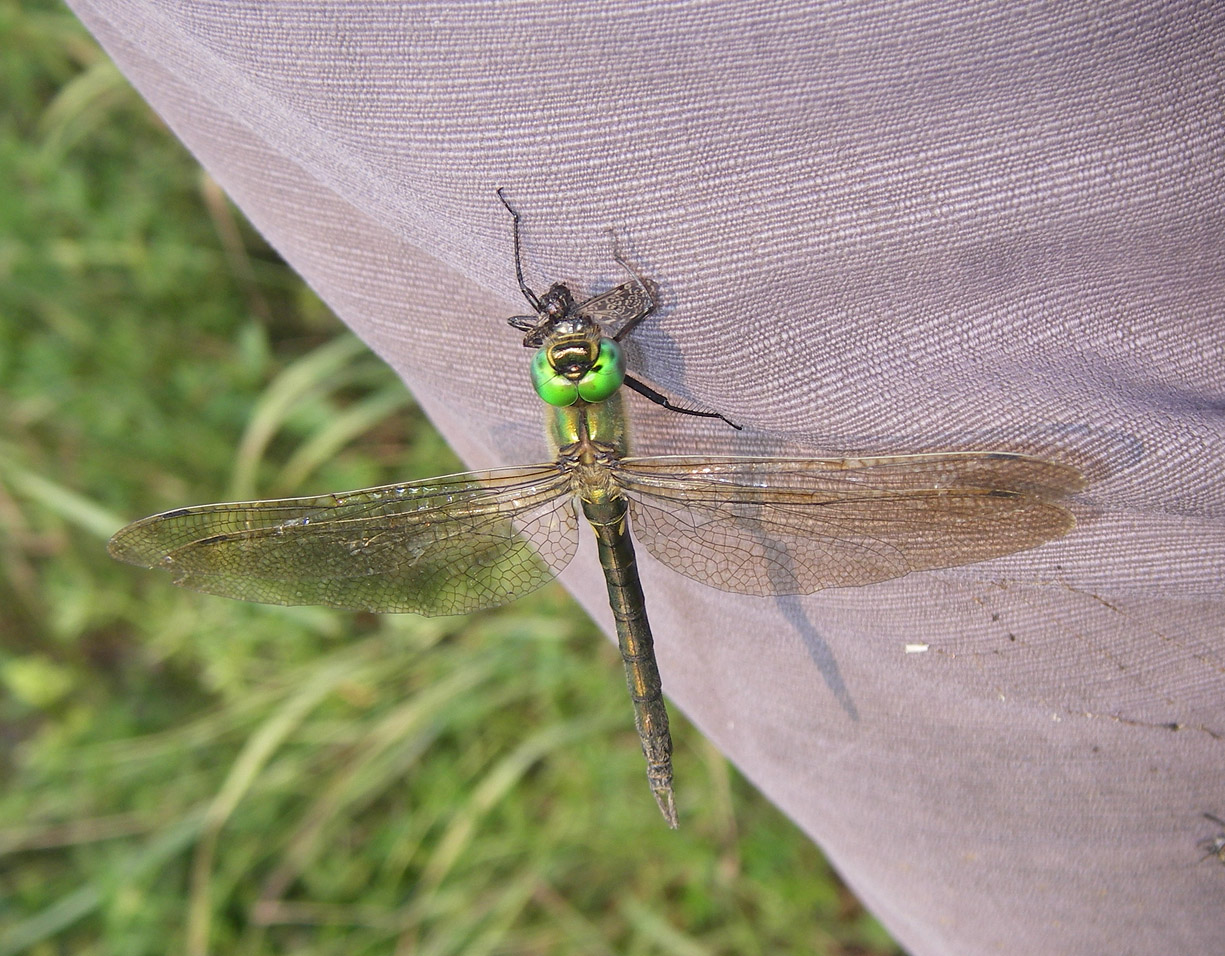 Бабка металлическая - Somatochlora metallica, самка, поймавшая дождевку на брюках.