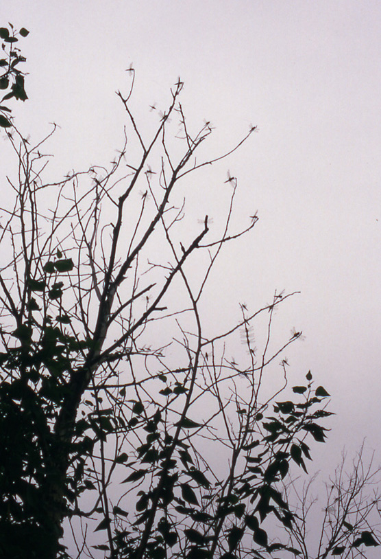 Numerous individuals landing to overnight on dry twigs of a wind- breaking stripe near the Karasuk River.