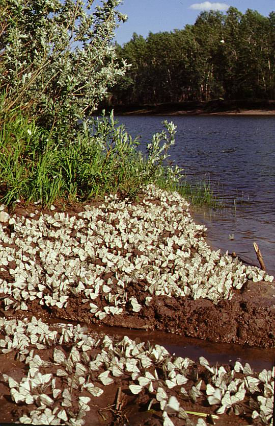 This is the most abundant and omnipresent (and, besides, most simply coloured) butterfly almost everywhere in the forest zone and woody mountains of South Siberia. Almost every year these butterflies appear in immense quantities and fly throughout June, forming incredible congregations on wet ground and swarming at flowering plants. I also often observed these butterflies flying, separately from each other, not in swarms, in the same direction for days but don't know the reason for it. Their main foodplant is the bird cherry (Padus avium), and also Spiraea media, Crataegus sanguinea and other arboreal Rosaceae, in Yakutia, Amurland and Transbaikalia also Vaccinium uliginosum. The larvae live gregareously; they hibernate on silken winter nests on the foodplant branches. Being so abundant, they often almost defoliate small bird cherry trees, the pupae densely covering thick branches at 1-3 m above the ground. These butterflies copulate mostly when they are teneral, just having hatched from the pupae, which are placed usually close to each other. At the same time, most frequently observed and conspicupus element of sexual behaviour of these butterflies is female rejection to male attemnts to mate them, when a pair acquire a very expressive posture with the female widely spreading wings and lifting the abdomen, while male sits above it, moves the wing vigorously and hits the female's abdomen with its own. It looks like an antropomorphic mimic of human sexual intercourse, while in fact the already mated and inreceptive female just lifts its abdomen and spread its wing to prevent genitalic contact. is Thanks to such an expressive behaviour, many females loose most scales from their fore wings which appear almost transparent and look dark. Besides, hind wings of these butterflies are often brightly coloured (red or yellow) with flower pollen. There are very few fruit trees in Siberia and, besides, they are not suffer from this species, which almost does not seem to cause any substantial harm even for adult trees of its main foodplant bird cherry. But almost all local population traditionally beleive these are large whites (Pieris brassice, in Russian "kapustnitsa", i.e. "a cabbager") which eat their cabbage. In fact P. brassice penetrated into West Siberia only about 35 (first recorded by Y.P. Korshunov) and become abundant about 20 years ago, the cabbage suffering mostly from Pieris rapae.