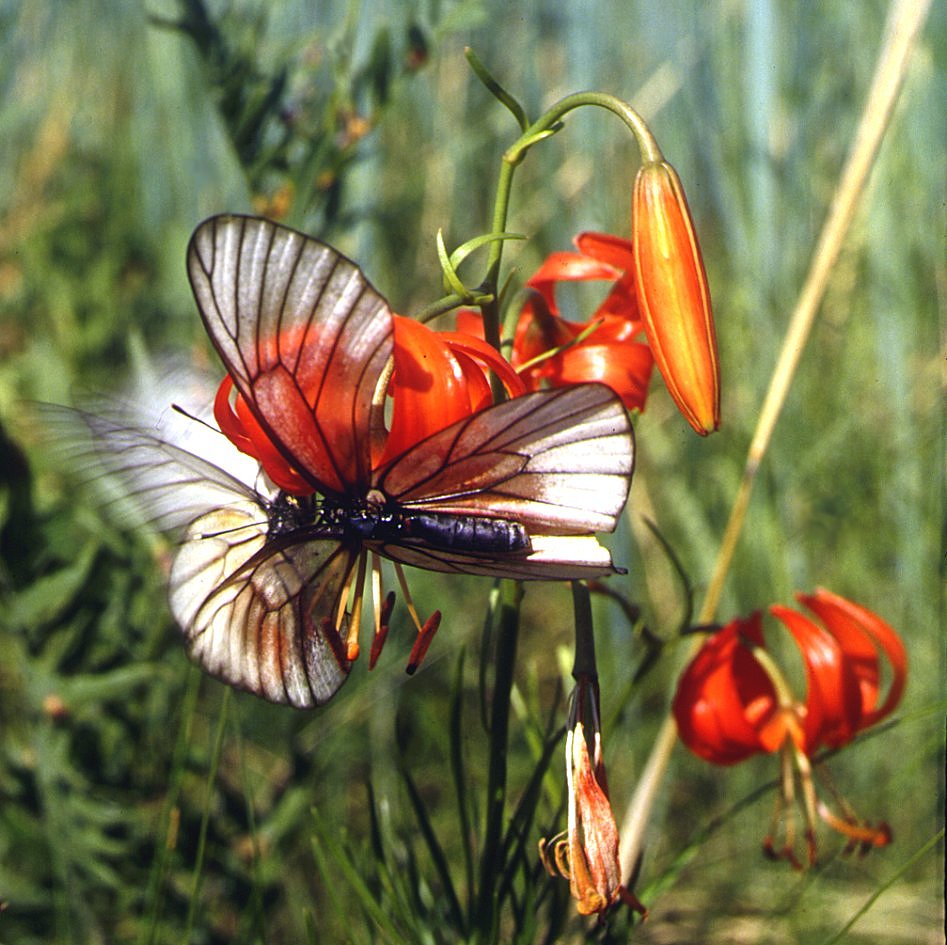 This is the most abundant and omnipresent (and, besides, most simply coloured) butterfly almost everywhere in the forest zone and woody mountains of South Siberia. Almost every year these butterflies appear in immense quantities and fly throughout June, forming incredible congregations on wet ground and swarming at flowering plants. I also often observed these butterflies flying, separately from each other, not in swarms, in the same direction for days but don't know the reason for it. Their main foodplant is the bird cherry (Padus avium), and also Spiraea media, Crataegus sanguinea and other arboreal Rosaceae, in Yakutia, Amurland and Transbaikalia also Vaccinium uliginosum. The larvae live gregareously; they hibernate on silken winter nests on the foodplant branches. Being so abundant, they often almost defoliate small bird cherry trees, the pupae densely covering thick branches at 1-3 m above the ground. These butterflies copulate mostly when they are teneral, just having hatched from the pupae, which are placed usually close to each other. At the same time, most frequently observed and conspicupus element of sexual behaviour of these butterflies is female rejection to male attemnts to mate them, when a pair acquire a very expressive posture (see this slide) with the female widely spreading wings and lifting the abdomen, while male sits above it, moves the wing vigorously and hits the female's abdomen with its own. It looks like an antropomorphic mimic of human sexual intercourse, while in fact the already mated and inreceptive female just lifts its abdomen and spread its wing to prevent genitalic contact. is Thanks to such an expressive behaviour, many females loose most scales from their fore wings which appear almost transparent and look dark. Besides, hind wings of these butterflies are often brightly coloured (red or yellow) with flower pollen. There are very few fruit trees in Siberia and, besides, they are not suffer from this species, which almost does not seem to cause any substantial harm even for adult trees of its main foodplant bird cherry. But almost all local population traditionally beleive these are large whites (Pieris brassice, in Russian "kapustnitsa", i.e. "a cabbager") which eat their cabbage. In fact P. brassice penetrated into West Siberia only about 35 (first recorded by Y.P. Korshunov) and become abundant about 20 years ago, the cabbage suffering mostly from Pieris rapae.