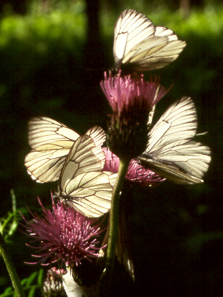 This is the most abundant and omnipresent (and, besides, most simply coloured) butterfly almost everywhere in the forest zone and woody mountains of South Siberia. Almost every year these butterflies appear in immense quantities and fly throughout June, forming incredible congregations on wet ground and swarming at flowering plants. I also often observed these butterflies flying, separately from each other, not in swarms, in the same direction for days but don't know the reason for it. Their main foodplant is the bird cherry (Padus avium), and also Spiraea media, Crataegus sanguinea and other arboreal Rosaceae, in Yakutia, Amurland and Transbaikalia also Vaccinium uliginosum. The larvae live gregareously; they hibernate on silken winter nests on the foodplant branches. Being so abundant, they often almost defoliate small bird cherry trees, the pupae densely covering thick branches at 1-3 m above the ground. These butterflies copulate mostly when they are teneral, just having hatched from the pupae, which are placed usually close to each other. At the same time, most frequently observed and conspicupus element of sexual behaviour of these butterflies is female rejection to male attemnts to mate them, when a pair acquire a very expressive posture with the female widely spreading wings and lifting the abdomen, while male sits above it, moves the wing vigorously and hits the female's abdomen with its own. It looks like an antropomorphic mimic of human sexual intercourse, while in fact the already mated and inreceptive female just lifts its abdomen and spread its wing to prevent genitalic contact. is Thanks to such an expressive behaviour, many females loose most scales from their fore wings which appear almost transparent and look dark. Besides, hind wings of these butterflies are often brightly coloured (red or yellow) with flower pollen. There are very few fruit trees in Siberia and, besides, they are not suffer from this species, which almost does not seem to cause any substantial harm even for adult trees of its main foodplant bird cherry. But almost all local population traditionally beleive these are large whites (Pieris brassice, in Russian "kapustnitsa", i.e. "a cabbager") which eat their cabbage. In fact P. brassice penetrated into West Siberia only about 35 (first recorded by Y.P. Korshunov) and become abundant about 20 years ago, the cabbage suffering mostly from Pieris rapae.