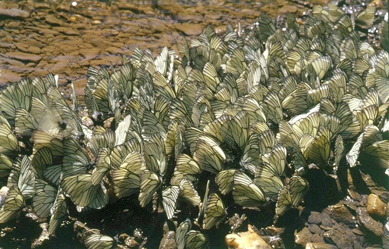 This is the most abundant and omnipresent (and, besides, most simply coloured) butterfly almost everywhere in the forest zone and woody mountains of South Siberia. Almost every year these butterflies appear in immense quantities and fly throughout June, forming incredible congregations on wet ground and swarming at flowering plants. I also often observed these butterflies flying, separately from each other, not in swarms, in the same direction for days but don't know the reason for it. Their main foodplant is the bird cherry (Padus avium), and also Spiraea media, Crataegus sanguinea and other arboreal Rosaceae, in Yakutia, Amurland and Transbaikalia also Vaccinium uliginosum. The larvae live gregareously; they hibernate on silken winter nests on the foodplant branches. Being so abundant, they often almost defoliate small bird cherry trees, the pupae densely covering thick branches at 1-3 m above the ground. These butterflies copulate mostly when they are teneral, just having hatched from the pupae, which are placed usually close to each other. At the same time, most frequently observed and conspicupus element of sexual behaviour of these butterflies is female rejection to male attemnts to mate them, when a pair acquire a very expressive posture with the female widely spreading wings and lifting the abdomen, while male sits above it, moves the wing vigorously and hits the female's abdomen with its own. It looks like an antropomorphic mimic of human sexual intercourse, while in fact the already mated and inreceptive female just lifts its abdomen and spread its wing to prevent genitalic contact. is Thanks to such an expressive behaviour, many females loose most scales from their fore wings which appear almost transparent and look dark. Besides, hind wings of these butterflies are often brightly coloured (red or yellow) with flower pollen. There are very few fruit trees in Siberia and, besides, they are not suffer from this species, which almost does not seem to cause any substantial harm even for adult trees of its main foodplant bird cherry. But almost all local population traditionally beleive these are large whites (Pieris brassice, in Russian "kapustnitsa", i.e. "a cabbager") which eat their cabbage. In fact P. brassice penetrated into West Siberia only about 35 (first recorded by Y.P. Korshunov) and become abundant about 20 years ago, the cabbage suffering mostly from Pieris rapae.