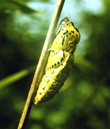If pupating among green vegetation, the pupa appears of a yellowish-green ground colour, otherwice of whitish
