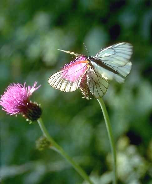 This is the most abundant and omnipresent (and, besides, most simply coloured) butterfly almost everywhere in the forest zone and woody mountains of South Siberia. Almost every year these butterflies appear in immense quantities and fly throughout June, forming incredible congregations on wet ground and swarming at flowering plants. I also often observed these butterflies flying, separately from each other, not in swarms, in the same direction for days but don't know the reason for it. Their main foodplant is the bird cherry (Padus avium), and also Spiraea media, Crataegus sanguinea and other arboreal Rosaceae, in Yakutia, Amurland and Transbaikalia also Vaccinium uliginosum. The larvae live gregareously; they hibernate on silken winter nests on the foodplant branches. Being so abundant, they often almost defoliate small bird cherry trees, the pupae densely covering thick branches at 1-3 m above the ground. These butterflies copulate mostly when they are teneral, just having hatched from the pupae, which are placed usually close to each other. At the same time, most frequently observed and conspicupus element of sexual behaviour of these butterflies is female rejection to male attemnts to mate them, when a pair acquire a very expressive posture (see this image) with the female widely spreading wings and lifting the abdomen, while male sits above it, moves the wing vigorously and hits the female's abdomen with its own. It looks like an antropomorphic mimic of human sexual intercourse, while in fact the already mated and inreceptive female just lifts its abdomen and spread its wing to prevent genitalic contact. is Thanks to such an expressive behaviour, many females loose most scales from their fore wings which appear almost transparent and look dark. Besides, hind wings of these butterflies are often brightly coloured (red or yellow) with flower pollen. There are very few fruit trees in Siberia and, besides, they are not suffer from this species, which almost does not seem to cause any substantial harm even for adult trees of its main foodplant bird cherry. But almost all local population traditionally beleive these are large whites (Pieris brassice, in Russian "kapustnitsa", i.e. "a cabbager") which eat their cabbage. In fact P. brassice penetrated into West Siberia only about 35 (first recorded by Y.P. Korshunov) and become abundant about 20 years ago, the cabbage suffering mostly from Pieris rapae.