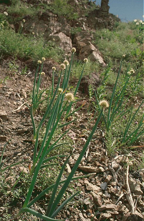 Allium altaicum Pallas (= Allium fistulosum auct. non L.) grows on dry rocks in the mountains of Central Asia, South Siberia, Mongolia and N China.
