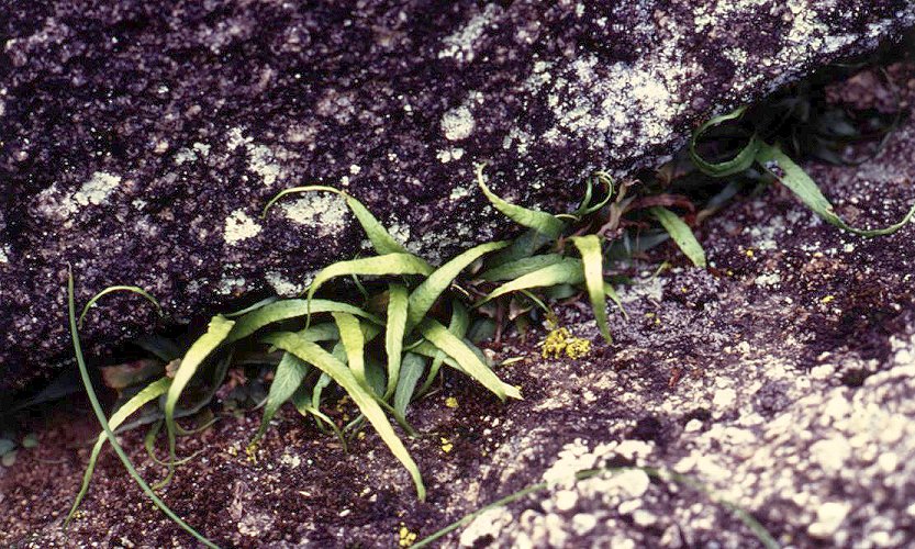 Camptosorus sibiricus Rupr., маленький скальный папоротник с цельными листьями с выводковой почкой на вытянутой вершине, распространенный от Средней Сибири до Тихого океана.