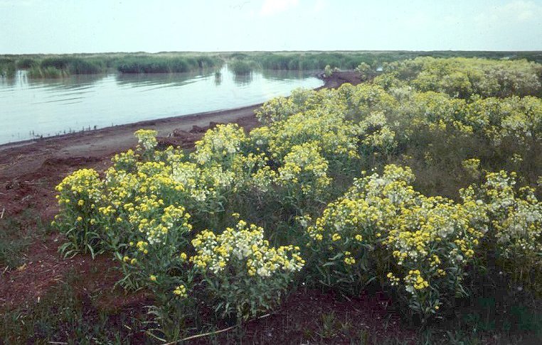 The bank of a large brackish (calcium and magnium carbonates) Lake Zun-Torei, residing in Dahurian (S Transbaikalian) short-grass steppes. The lake flutcuate down to almost dissapearing with a cycle about 30 years, now it's on the maximum. The bank is grown up with Senecio congestus (R.Br.) DC. (= Senecio arcticus Rupr.), and the reed (Phragmitis australis (Gav.) Trin ex Steudel.)