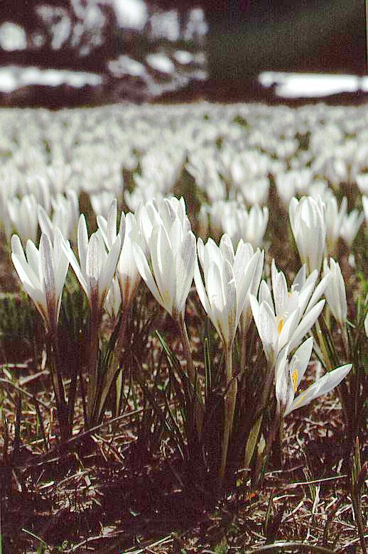 Flowering Crocus alatavicus Regel et Schmahl. densely covers open places within the forest and subalpine belt in the Northern Dzhungarian Alatau Mountain Chain just after snow melting. Most of these places are overgrazed by sheep in summer, but this ephemeroid species is nearly of advantage in these conditions as being too early to be trumpled out and enjoing a heavily fertilized soil.