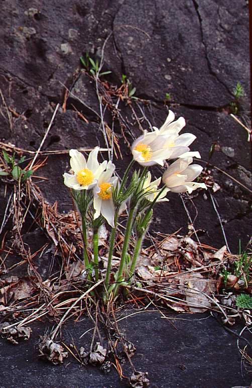 Pulsatilla patens (L.) Muller (= Pulsatilla flavescens (Zucc.) Juz.), a white form, on the rocks on the Berd' River right bank 5 km east of the village Novososedovo, Iskitim District, Novosibirsk Region, West Siberia, Russia. 10th of July 1996.