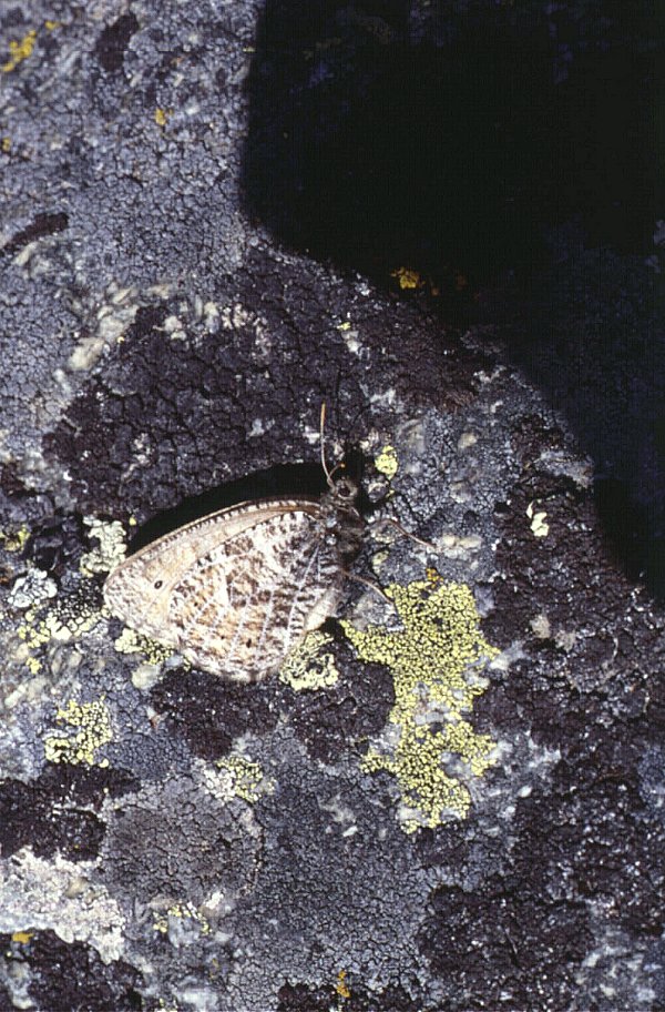 In the Altai highlands, this Oeneis species flies on dry slopes and Kobresia tundras. This male is photographed in the morning. It sits slanting so that the sun heats its wing the best. Besides, in this posture it is especially cryptic looking like a lichen on the stone.