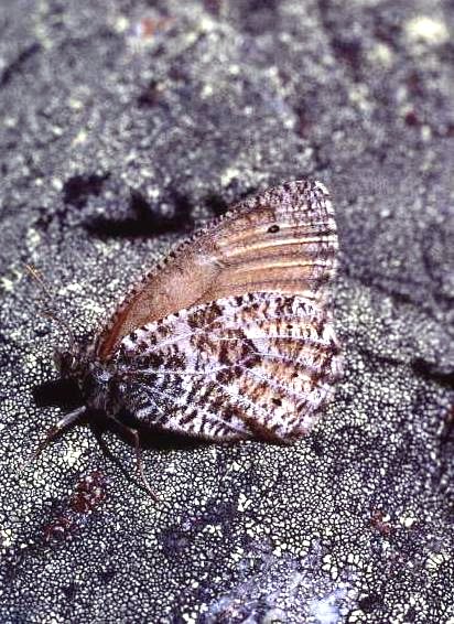 In the Altai highlands, this Oeneis species flies on dry slopes and Kobresia tundras. This male is photographed in the morning. It sits slanting so that the sun heats its wing the best. Besides, in this posture it is especially cryptic looking like a lichen on the stone.
