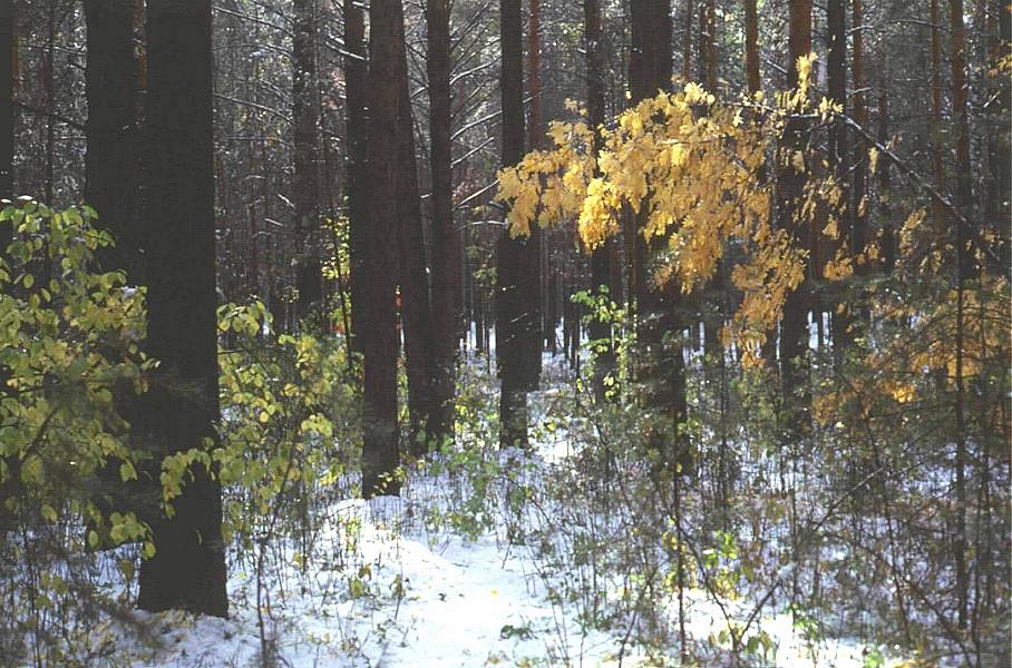 An unexpected September snow in a common pine (Pinus sylvestris L.) forest. Yellow-orange is a Siberian Rowan-tree (Sorbus sibiricus Hedl.)