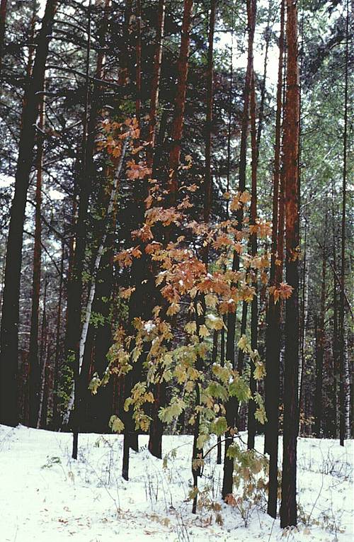 An unexpected September snow in a common pine (Pinus sylvestris L.) forest. Yellow-orange is a Siberian Rowan-tree (Sorbus sibiricus Hedl.)