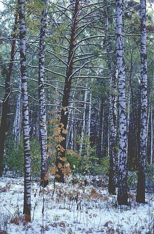 An unexpected September snow in a mixed white birch (Betula pendula Roth.; = Betula verrucosa Ehrh.)/common pine (Pinus sylvestris L.) forest. Yellow-orange is a Siberian Rowan-tree (Sorbus sibiricus Hedl.)